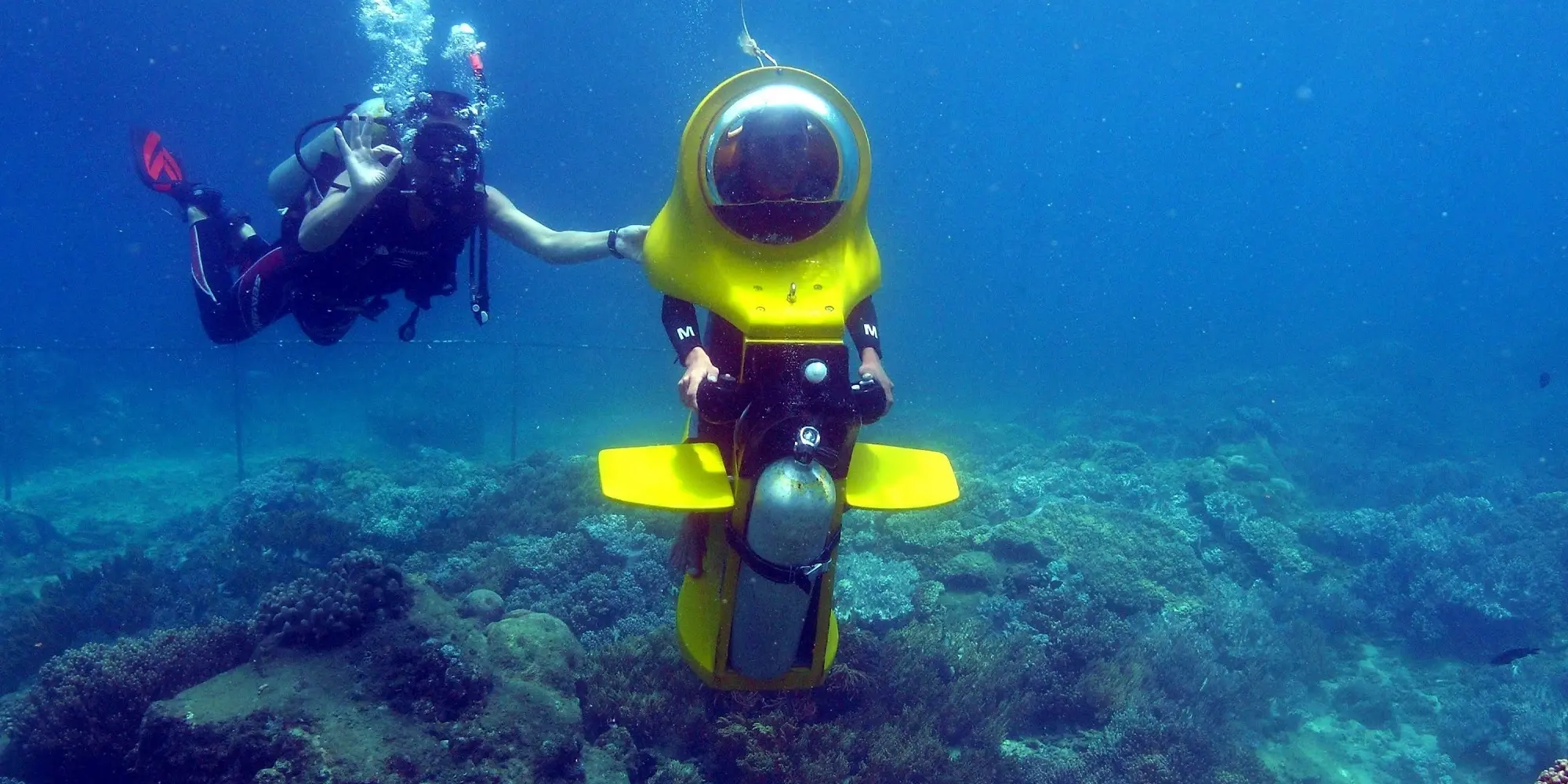 اسکوتر غواصی کیش به عنوان کوچکترین نمونه زیردریایی ساختهشده توسط انسان، شما را با زندگی در زیرآب آشنا میکند و محیط دریا را مثل یک آکواریوم عظیم خواهید دید. با استفاده از این اسکوترها، سر شما با آب تماس پیدا نمیکند و تنفسی طبیعی دارید، در حالی که دستهایتان آزادند و حتی میتوانید ماهیها را لمس کنید.